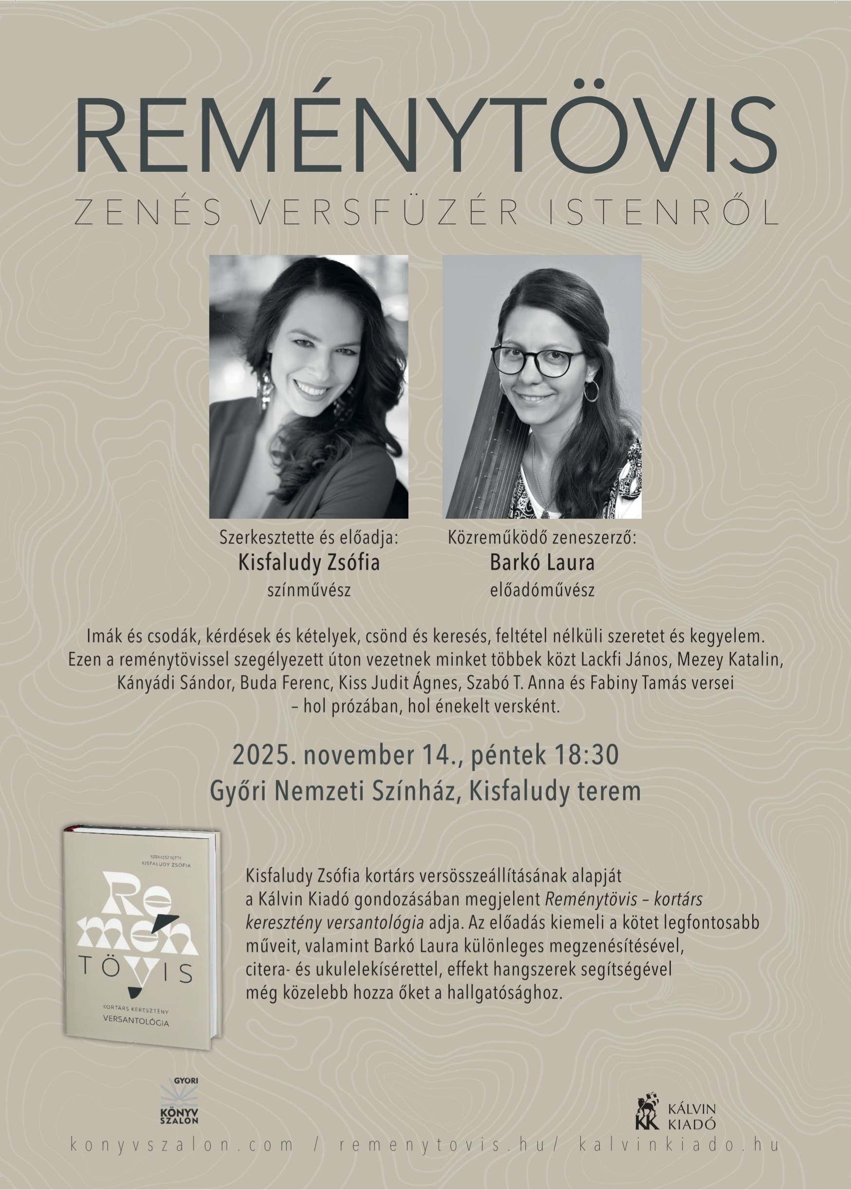 Szeretettel várjuk az érdeklődőket 2025. november 14. és 16. között a Győri Könyvszalonra, a Magyar Bibliatársulat és a Kálvin Kiadó könyves standjához és a Reménytövis – zenés versfüzér Istenről c. előadásra (november 14., péntek 18.30, Kisfaludy terem)!