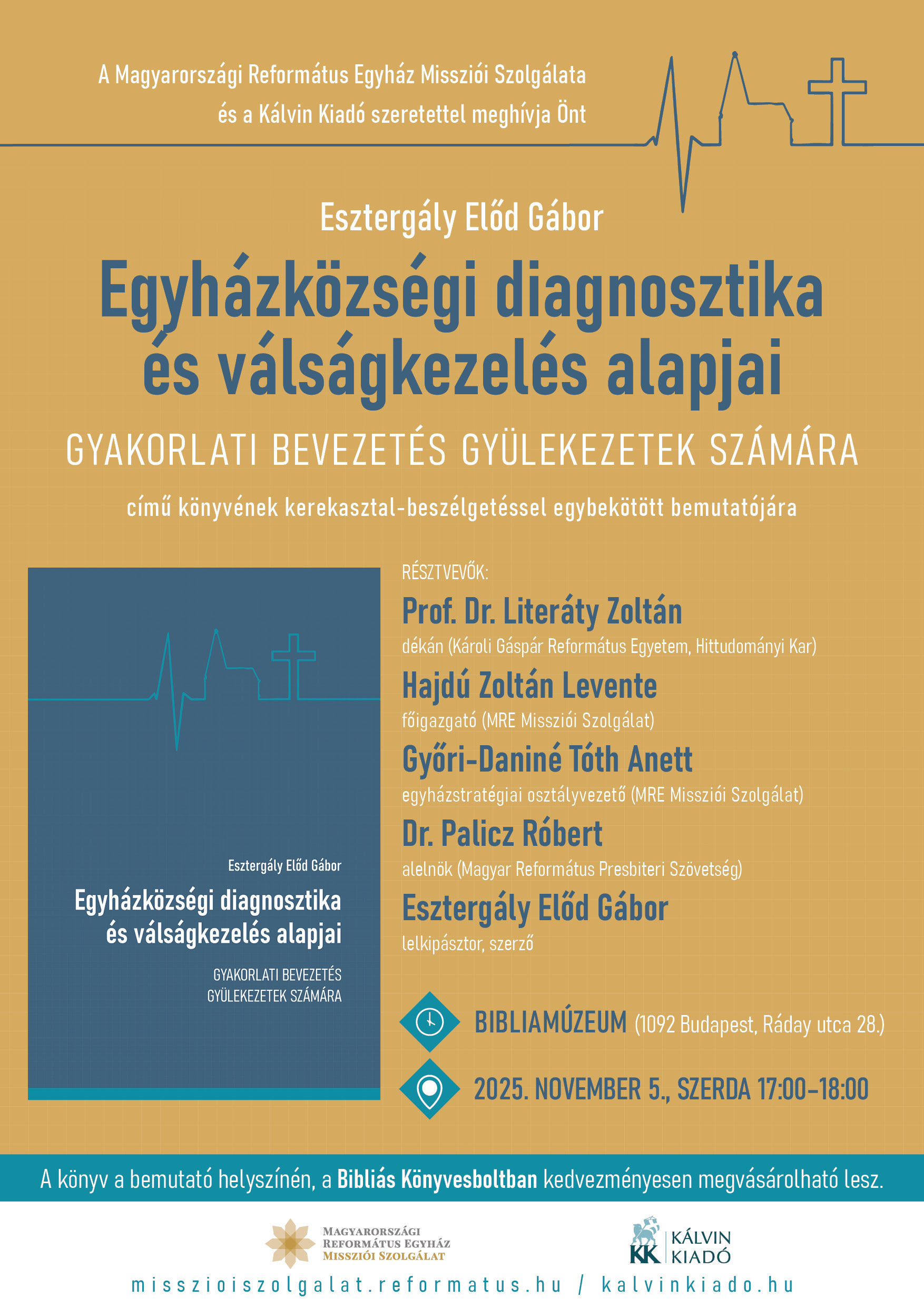 Esztergály Előd református lelkipásztor Egyházközségi diagnosztika és válságkezelés alapjai – Gyakorlati bevezetés gyülekezetek számára című könyvének kerekasztal-beszélgetéssel egybekötött bemutatója 2025. november 5-én, szerdán 17 órai kezdettel lesz a Bibliamúzeumban.
