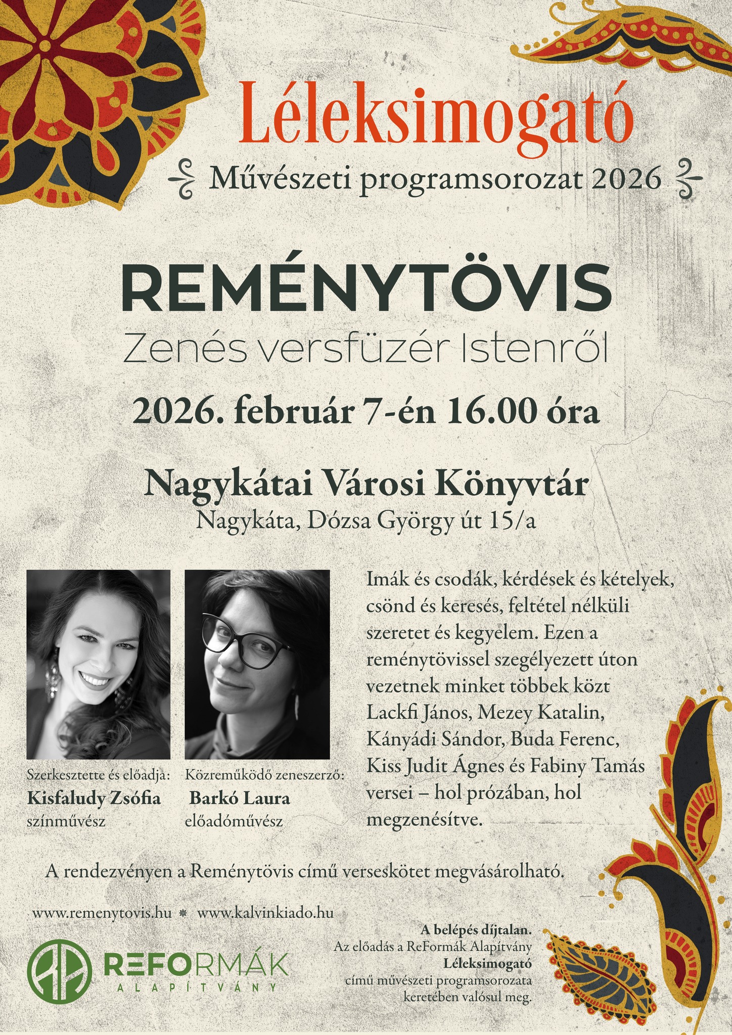 Kisfaludy Zsófia színművész és Barkó Laura előadóművész 2026. február 7-én, szombaton a Nagykátai Városi Könyvtárban adja elő a Reménytövis című versantológia legfontosabb műveit különleges zenei  kísérettel.