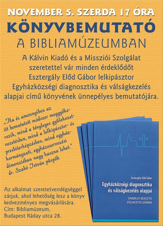 Esztergály Előd református lelkipásztor Egyházközségi diagnosztika és válságkezelés alapjai című könyvének bemutatója 2025. november 5-én, szerdán 17 órai kezdettel lesz a Bibliamúzeumban.