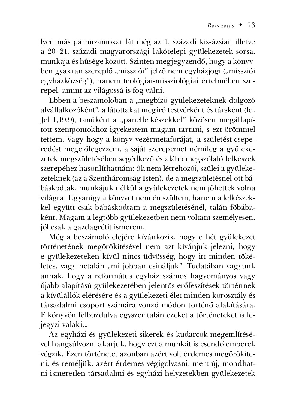 Mi haszna annak, ha egy gyülekezettípus létrejöttéről szóló könyvet bocsátanak a református olvasóközönség elé? Miért érdekelné egy egyutcás, szalagtelkes település elöregedő igehallgatóit és igehirdetőjét az, hogyan kell gyülekezetet építeni a kisvárosnyi embert elnyelő, nagyvárosi lakótelepeken? Egy új és nagy haszna és kihívása mindenképpen van ennek: ez a könyv nem az ember belső, lelki szobájának könyvespolcára való, egyéni csendességekhez. Ez a könyv presbiteri gyűlésekhez, terített asztalokhoz való, együtt gondolkozni tudó és akaró közösséget kíván, valamint azt, hogy újabb és újabb kötetek kövessék: születő falusi, kisvárosi, újjászülető hagyományos gyülekezetek híradásai saját életükről.