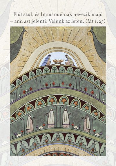 A képeslap Szűcsné Novák Mária Immánuél: Velünk az Isten című tűzzománc képének felhasználásával készült.