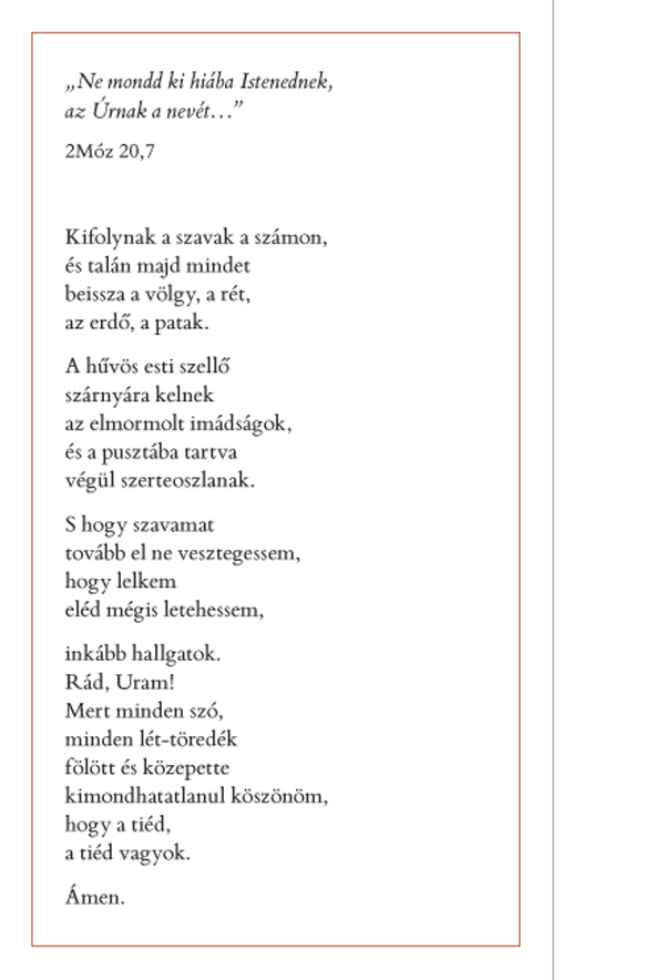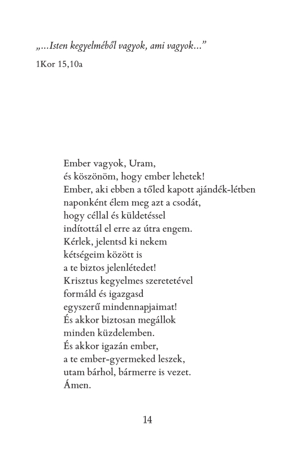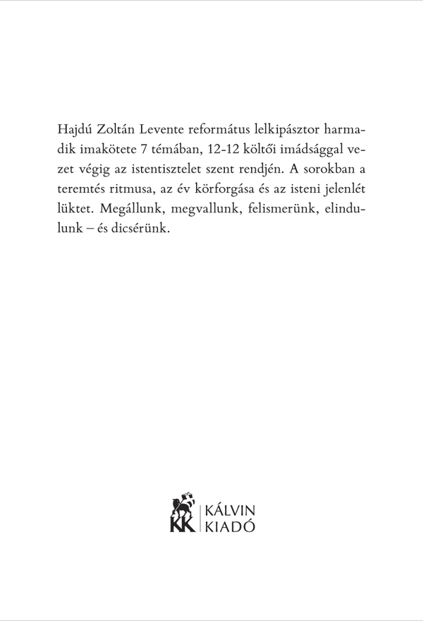 Hajdú Zoltán Levente református lelkipásztor harmadik imakötete 7 témában, 12-12 költői imádsággal vezet végig az istentisztelet szent rendjén. A sorokban a teremtés ritmusa, az év körforgása és az isteni jelenlét lüktet. Megállunk, megvallunk, felismerünk, elindulunk – és dicsérünk.