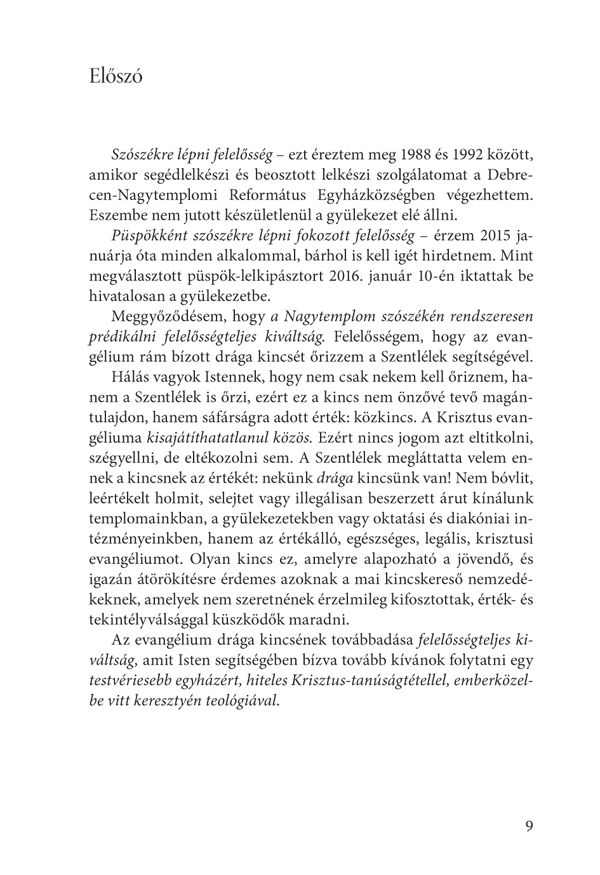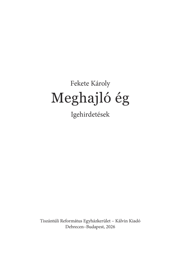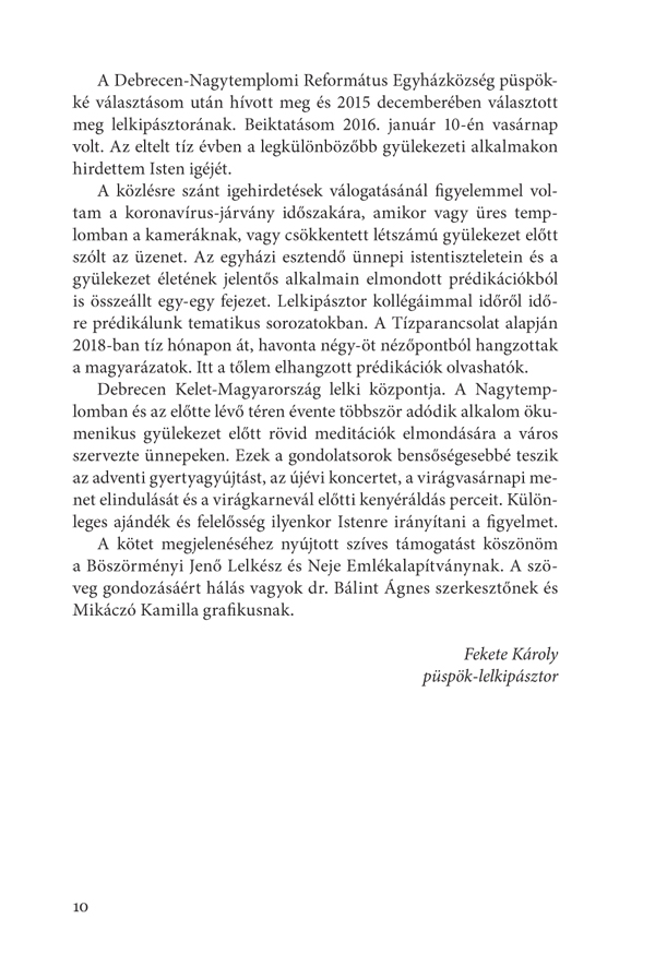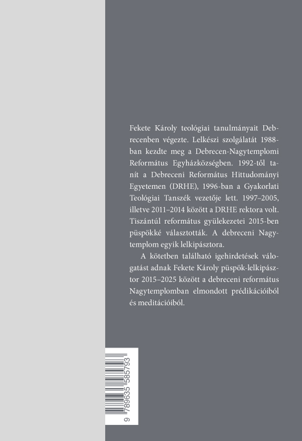 A kötetben található igehirdetések válogatást adnak Fekete Károly püspök-lelkipásztor 2015–2025 között a debreceni református Nagytemplomban elmondott prédikációiból és meditációiból.