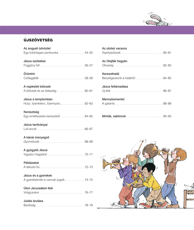 A Biblia tartalmára épülő könyvben 25 ó- és 18 újszövetségi történetről olvashatunk. Az egyszerűen elbeszélt történetek mellett találhatunk recepteket, ügyességi feladatokat, közösségi játékokat és a témákhoz kapcsolódó olyan érdekességeket, sok-sok vidám ötletet, amelyek nemcsak szórakoztatóak, de egy játék erejéig összehozhatják a családot, s hasznosnak bizonyulhatnak az óvodai és általános iskolai nevelési munka során is. A könyvet barátságos, mosolyt fakasztó, színes illusztrációk hozzák még közelebb a kis olvasókhoz.