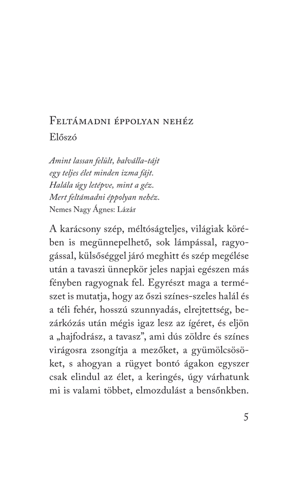 Bennem nem válik el ez a kettő ennyire élesen. Az irodalomnak is van egy nagyon meghatározó karakteres üzenete. E kötetben minden fejezetnek van egy igéje, amely meghatározza a húsvéti történetet, erősen kapcsolódik ezekhez az ünnepkörökhöz. Bogárdi Szabó Eszter szép grafikái is ezt erősítik. Az irodalmiság meghatározó volt: húsvéti népszokásokat leíró novella több is van, de én azt szeretem, amikor az irodalmi sík az igazi, régi, megtörtént eseményhez vezet bennünket, ezzel maivá és aktuálissá téve ezt az „eseményt”.