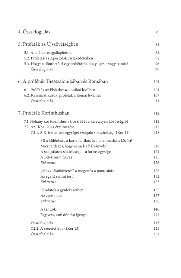 „Miközben könyvemben alapvetően az Újszövetség korára, ezen belül a sok népből kialakuló, Pál által alapított pogánykeresztyén gyülekezetekre, különös hangsúllyal a korinthusi közösségre fókuszálok, ezen közösségek vezetésének lehetséges formáit is felvázolom ebben a korban. Az elvégzett kutatásból kiderült számomra, hogy a közösségek karizmatikus vezetése egészen egyedi, sajátossága a sok népből elhívott közösségeknek, és szoros összefüggésben áll a közös hagyományok hiányával… ezért a karizmatikusok körének kellett magára vállalnia a gyülekezet irányítását. Viszont… ezek a karizmatikus vezetők csak karizmatikus közösségekben képesek hosszú távon ellátni ezt a feladatot, mert csak egy ilyen csoport alkalmas arra, hogy kontrollálja ezeket a személyeket. Az első pogánykeresztyén közösségek azáltal tudták kialakítani saját identitásukat, hogy a karizmatikusok, ezen belül a próféták kijelentését megvizsgálták, korrigálták, és ha kellett, akkor ellent is mondtak annak.”